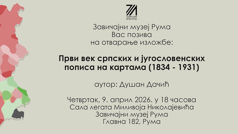 Прочитај више ВЕЗ НАПЛАТЕ ПАРКИНГА ЗА ВАСКРСЗавичајни музеј Рума Главна 182, Рума четвртак 9. април 2026. у 18 часова улаз слободан Отварање изложбе „Први век српских и југословенских пописа на картама…