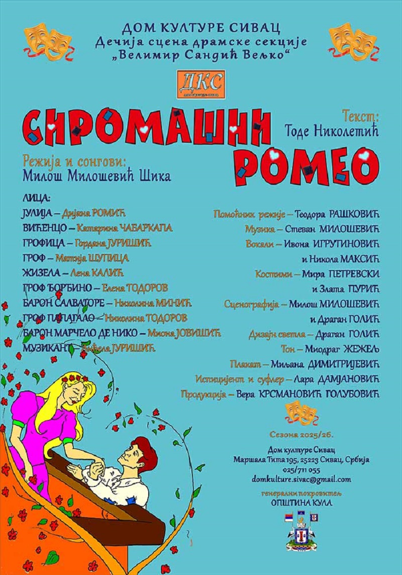 Премијера дечије представе ,,Сиромашни Ромео“, у извођењу Дечије сцене драмске секције ,,Велимир Сандић Вељко“ Дома културе Сивац, по тексту Тодета Николетића, а у режији Милоша Милошевића Шике, биће одржана у понедељак, 31. марта, са почетком у 20 часова.