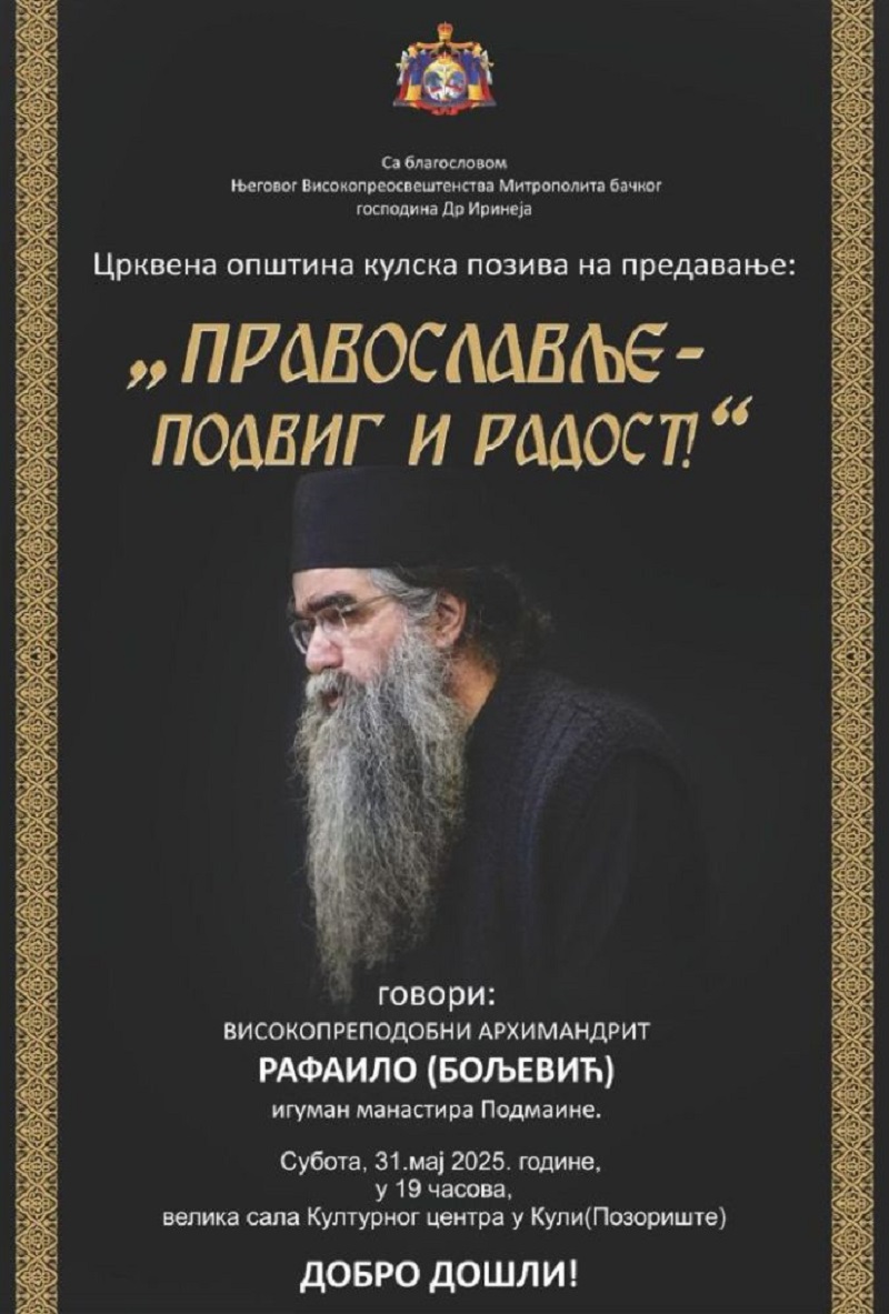 Са благословом Његовог Високопреосвештенства Митрополита бачког господина др Иринеја Црквена општина кулска позива на предавање „Православље-подвиг и радост!“ током којег ће говорити Високопреподобни архимандрит Рафаило Бољевић, игуман манастира Подмаине. Предавање ће се одржати у суботу, 31. маја са почетком у 19 часова у Позоришној сали Културног центра у Кули.