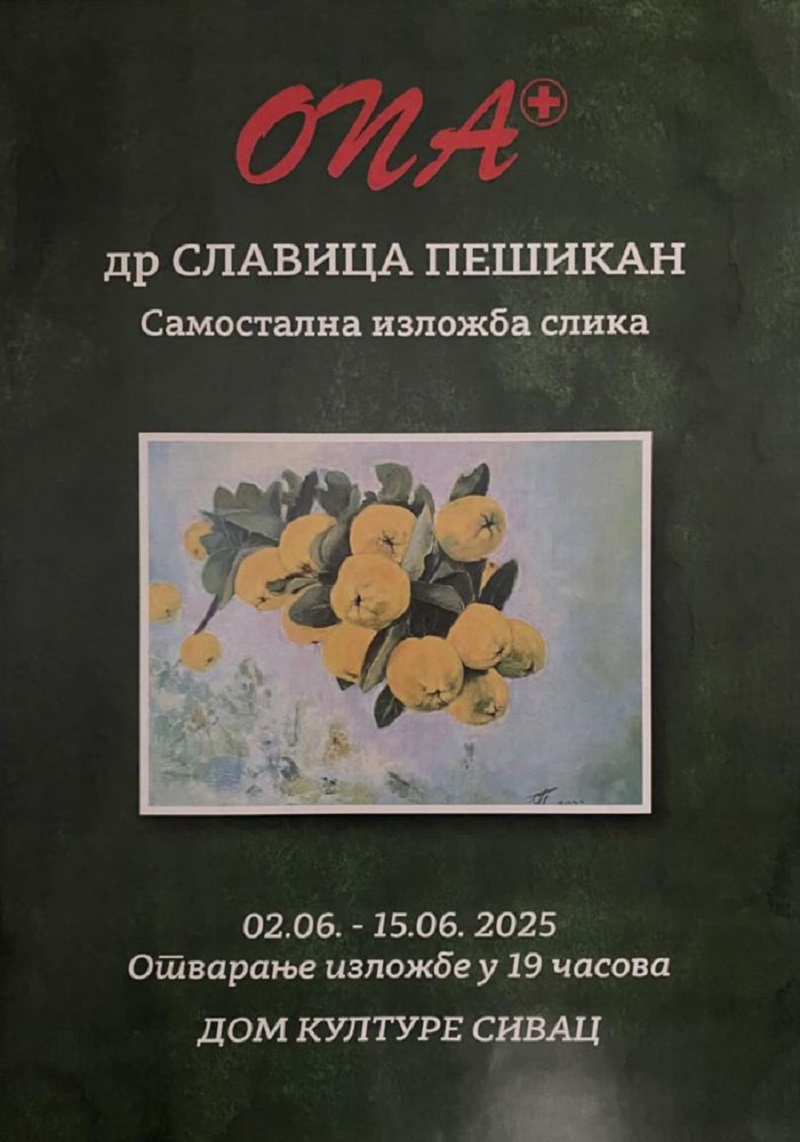 У понедељак, 2. јуна у 19 часова, у холу Дома културе Сивац биће свечано отворена самостална изложба слика др Славице Пешикан. Изложбу ће отворити књижевник Божидар Цмиљанић, а она ће за посетиоце бити отворена до 15. јуна.