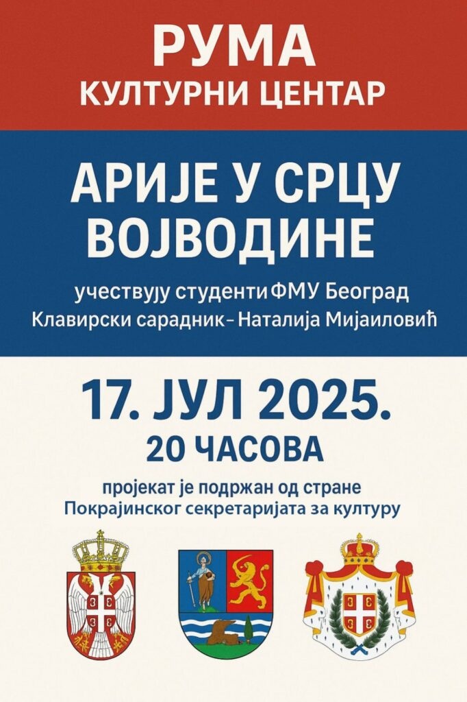 Концерт под називом „Арије у срцу Војводине“, одржаће се 17. јула 2025. године у Културном центру „Брана Црнчевић“ у Руми. Почетак концерта је у 20. часова.