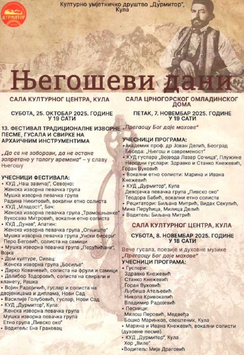 Данас, 7. новембра од 19 часова, у сали Црногорског омладинског дома учесници програма биће академик проф. др Јован Делић који ће беседити на тему ,,Његош и савременост“, КУД гуслара из Плужина и народни гуслари Здравко и Станко Кнежевић и Горан Вуковић, вокални етно солисти Марина и Ивана Кнежевић, као и Теодора Бабић, девојачка певачка група ,,Пивско око“ КУД ,,Дурмитор“ Кула и рецитатори Биљана Митрић, Видак Секулић, Мина Перућица и Милица Делић.