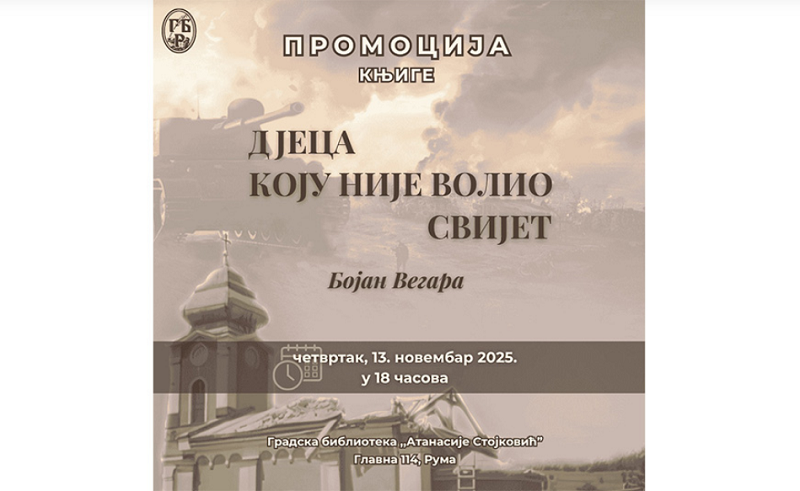 Представљање књиге „Дјеца коју није волио свијет“, аутора Бојана Вегаре, одржаће се у четвртак, 13. новембра 2025. године, у 18 часова, у Градској библиотеци „Атанасије Стојковић“ у Руми.