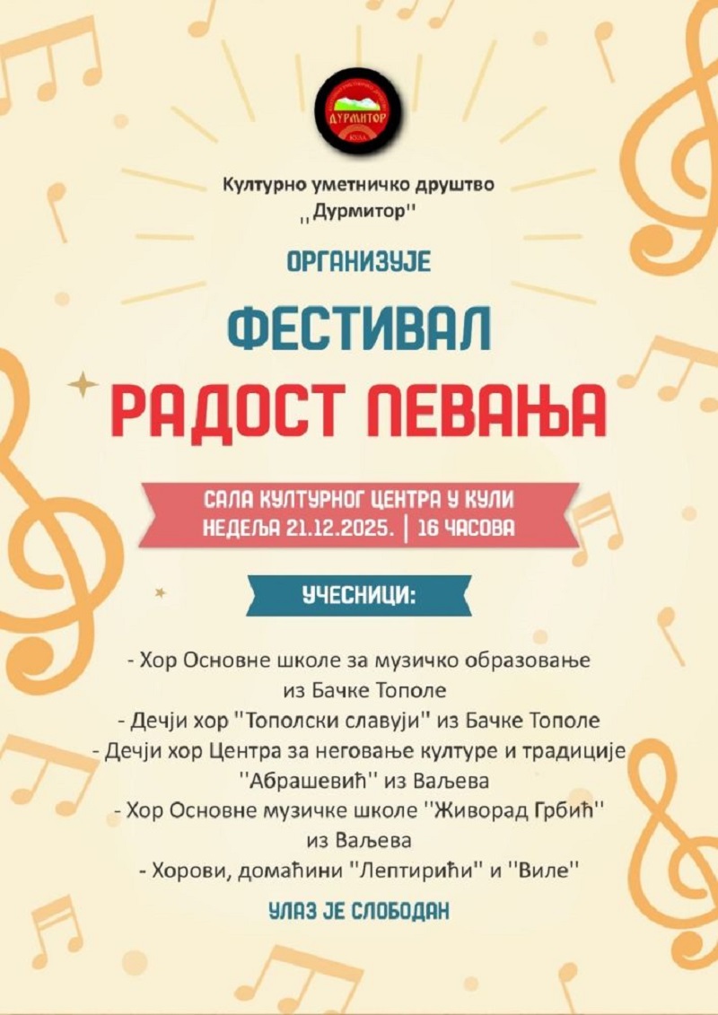 Културно – уметничко друштво ,,Дурмитор“ из Куле организује фестивал хорске музике ,,Радост певања“ који ће бити одржан у недељу, 21. децембра, са почетком у 16 часова у сали Културног центра у Кули.