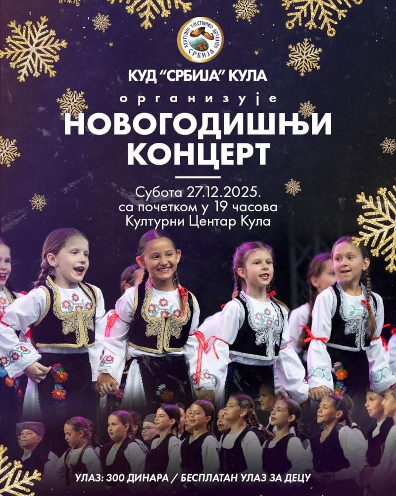 Културно уметничко друштво „Србија“ из Куле организује Новогодишњи концерт који ће се одржати у суботу, 27. децембра, са почетком у 19 часова у Позоришној сали Културног центра у Кули. Улаз је 300 динара, а за децу бесплатан.