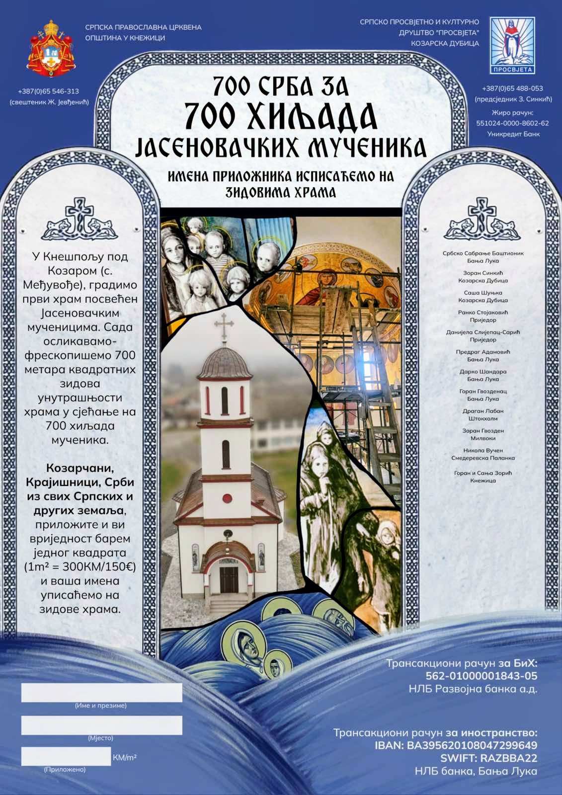 Овим путем позивам сав српски народ да помогне завршетак фрескописања 700 м2 храма Светих мученика Јасеновачких у Међувођу. Козарчани, Крајишници, Срби из свих српских и других земаља, приложите и ви вредност барем једног квадрата, (1м2 = 300КМ/150€.) и ваша имена уписаћемо на зидове храма.