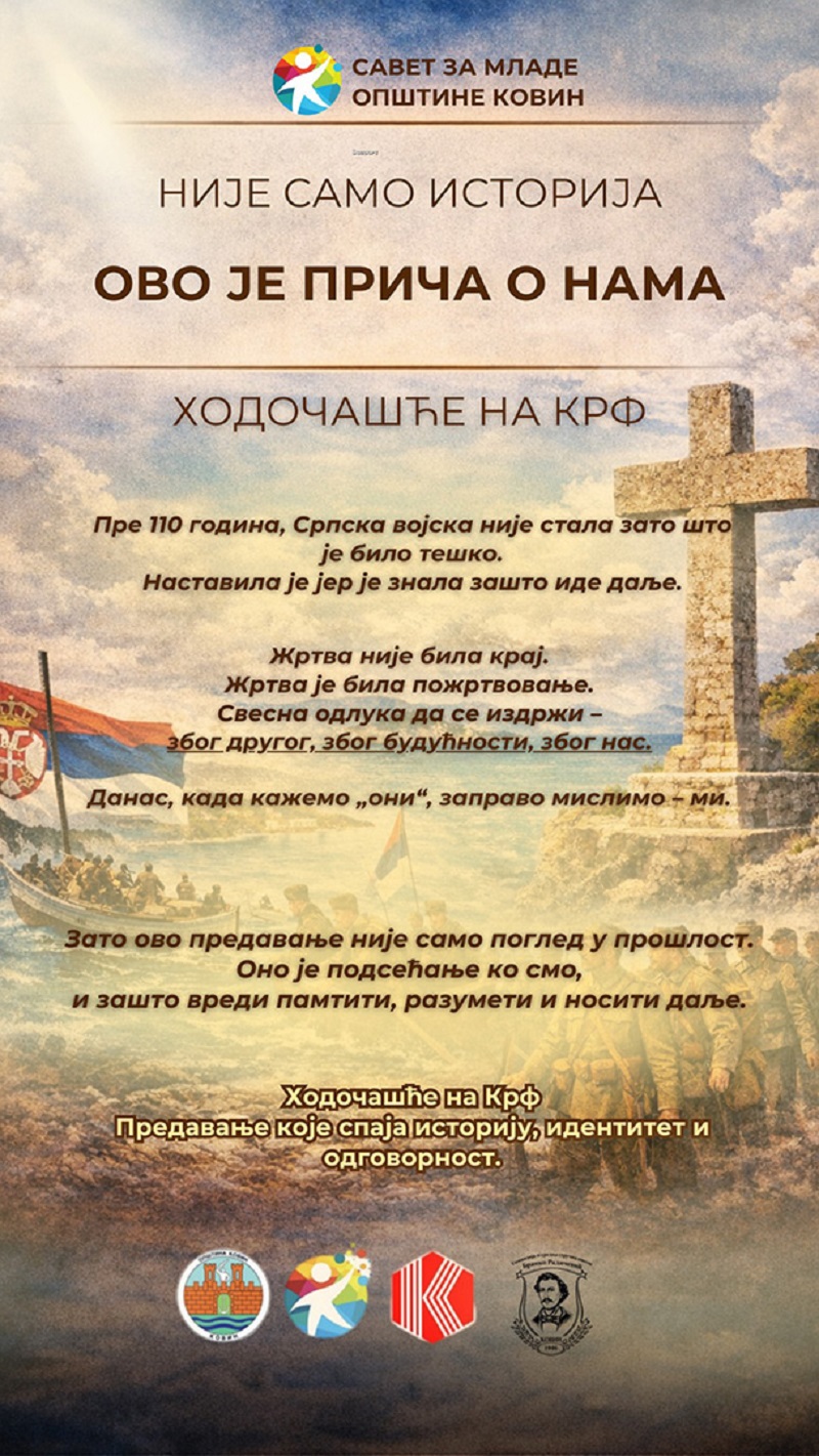 Савет за младе Општине Ковин, под покровитељством Општине Ковин, у сарадњи са Центром за културу Ковин и Гимназијом и средњом стручном школом „Бранко Радићевић“ Ковин, организује предавање „Ходочашће на Крф“, поводом обележавања 110 година од искрцавања српске војске на острво Крф.